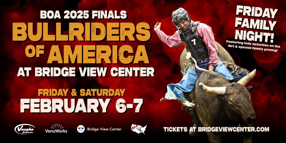 Head-slammin’ bone-jammin’ professional bull riding returns to Bridge View Center with Bullriders Of America (BOA) 2025 Finals. The BOA Association’s Top 25 bull riders from 2025 will compete for over $25,000 in cash and prizes Friday, February 6, 7:30 p.m., and Saturday, February 7, 7:30 p.m. The public is invited to a special Cowboy Breakfast on Saturday, February 7, 8 a.m. – 10:30 a.m. Reserved seating tickets start at $27.75; children 12-and-under seating starts at $15. VIP upgrade, that includes backstage experience, is $78. Family-four-pack pricing also available. Bundle and save. All tickets on-sale Friday, December 19, 10 a.m.
