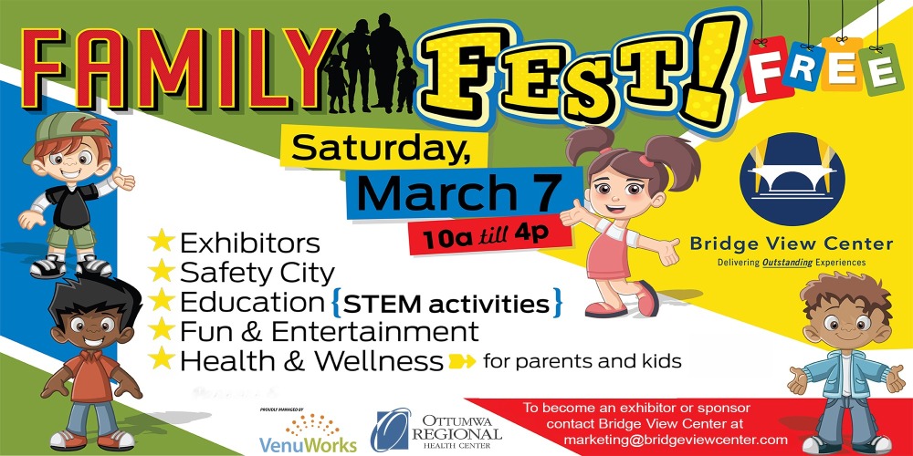 Looking to be a community partner? Want to tap into reaching Southeast Iowa families and community members ? Family Fest is a well-established, popular event. Bridge View Center is still seeking vendors and has space available. If you may be interested in participating as an exhibitor, please contact Brenda Cannon, Sales Manager at Bridge View Center, at 641-226-5350 or brenda@bridgeviewcenter.com.
